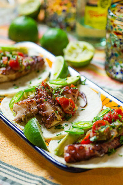 The Gigan Octopus, cooked to perfection and seasoned with a special spice blend and topped with sliced jalapenos and habaneros.Topped with a pineapple slaw. Handmade flour tortillas are ensured to be big enough to fit two to the plate. Can you eat it all?